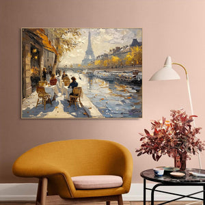 Afternoon at the Seine is a love letter to Paris. The warm sunlight, the peaceful cafe and the soft reflections on the water bring a sense of calm and beauty. Whether you've been to Paris or just dream of it, this painting brings that magic right to your space.