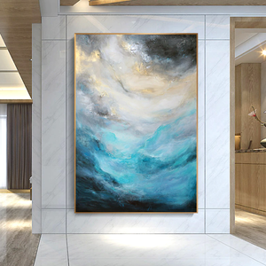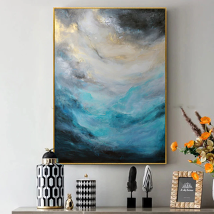 The vivid blue colours spark energy and beautifully blend towards more mysterious-looking, darker colours, resembling a powerful 'breeze' at a stormy sea. Waves crashing violently under a dark sky, what a sight to behold. This painting really comes alive.