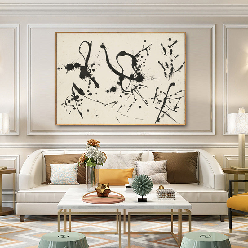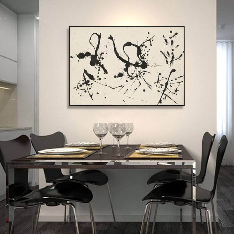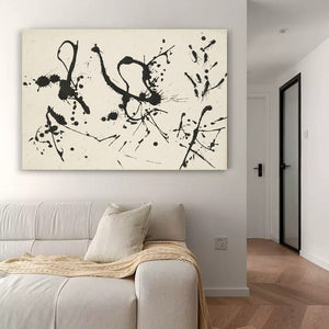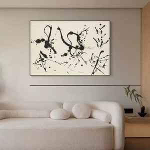 This modern artwork mesmerizes with its minimalist elegance. Stark black and white elements converge, creating a captivating interplay of contrasts. Each brushstroke speaks volumes, inviting you into a world of beautiful simplicity.