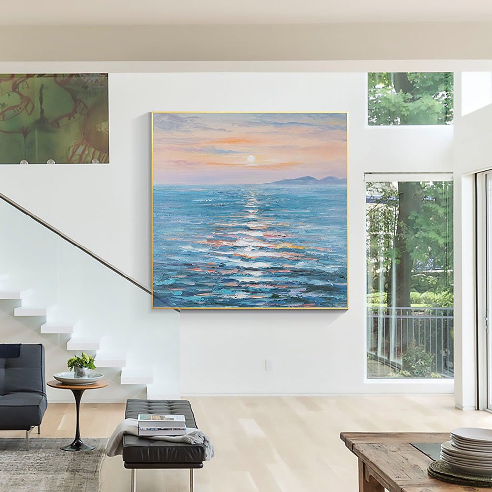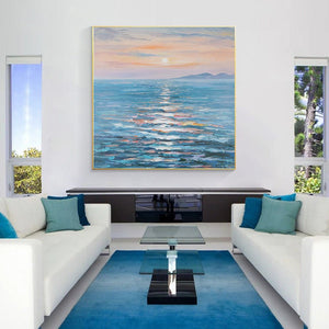 Wake up to the magic of the Cerulean Sunrise every day. This painting's soothing blues and soft pinks capture the essence of a peaceful morning by the sea. Perfect for creating a serene atmosphere in any room.