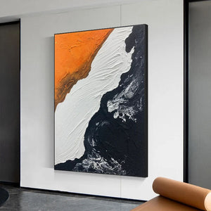 Charcoal Waves brings a bold contrast of color and texture to life. The painting’s dramatic black and white swirls, paired with the fiery orange, create a dynamic and captivating piece. Perfect for those who love art that makes a strong statement.