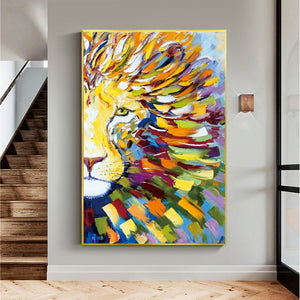 In this striking lion portrait, his manes is bursting with vibrant colors—showing of its vibrant majesty. The artist's strokes breathe life into the canvas, capturing the wild beauty of nature with a playful and vivid twist.