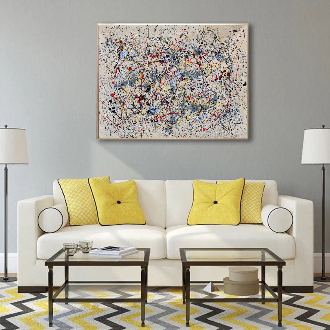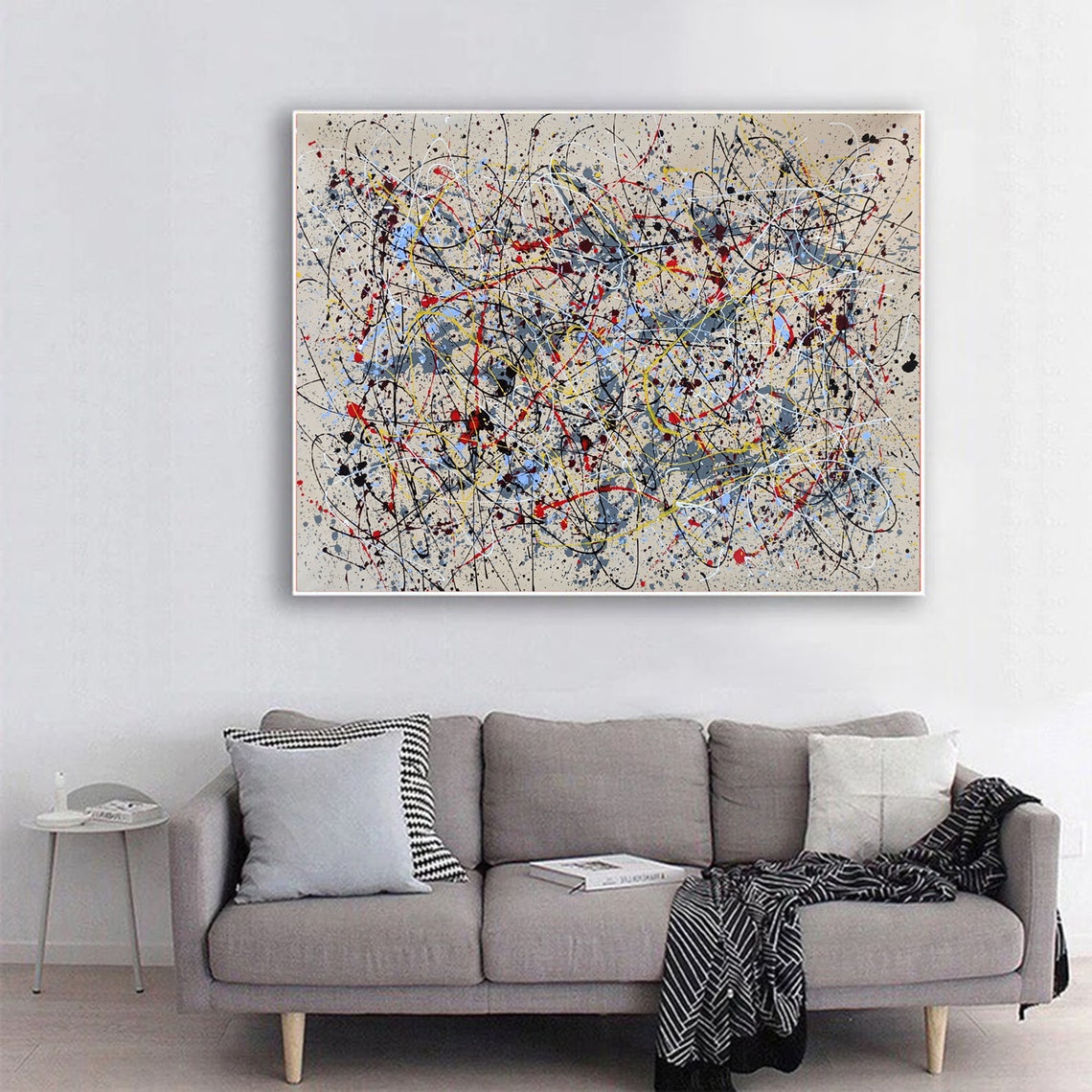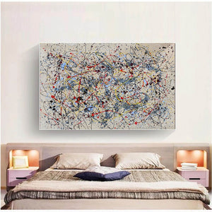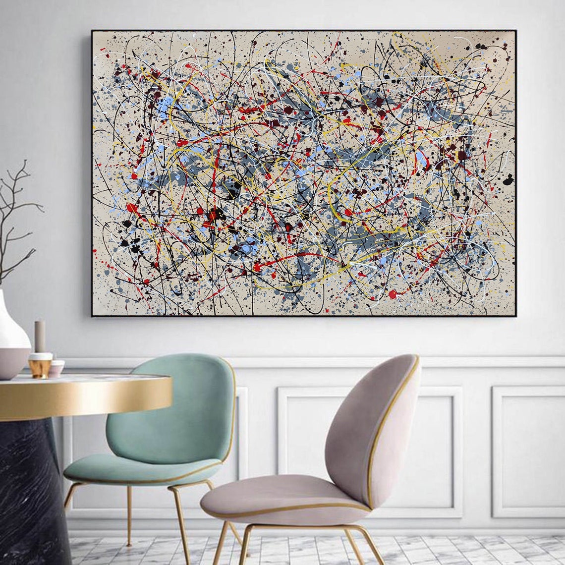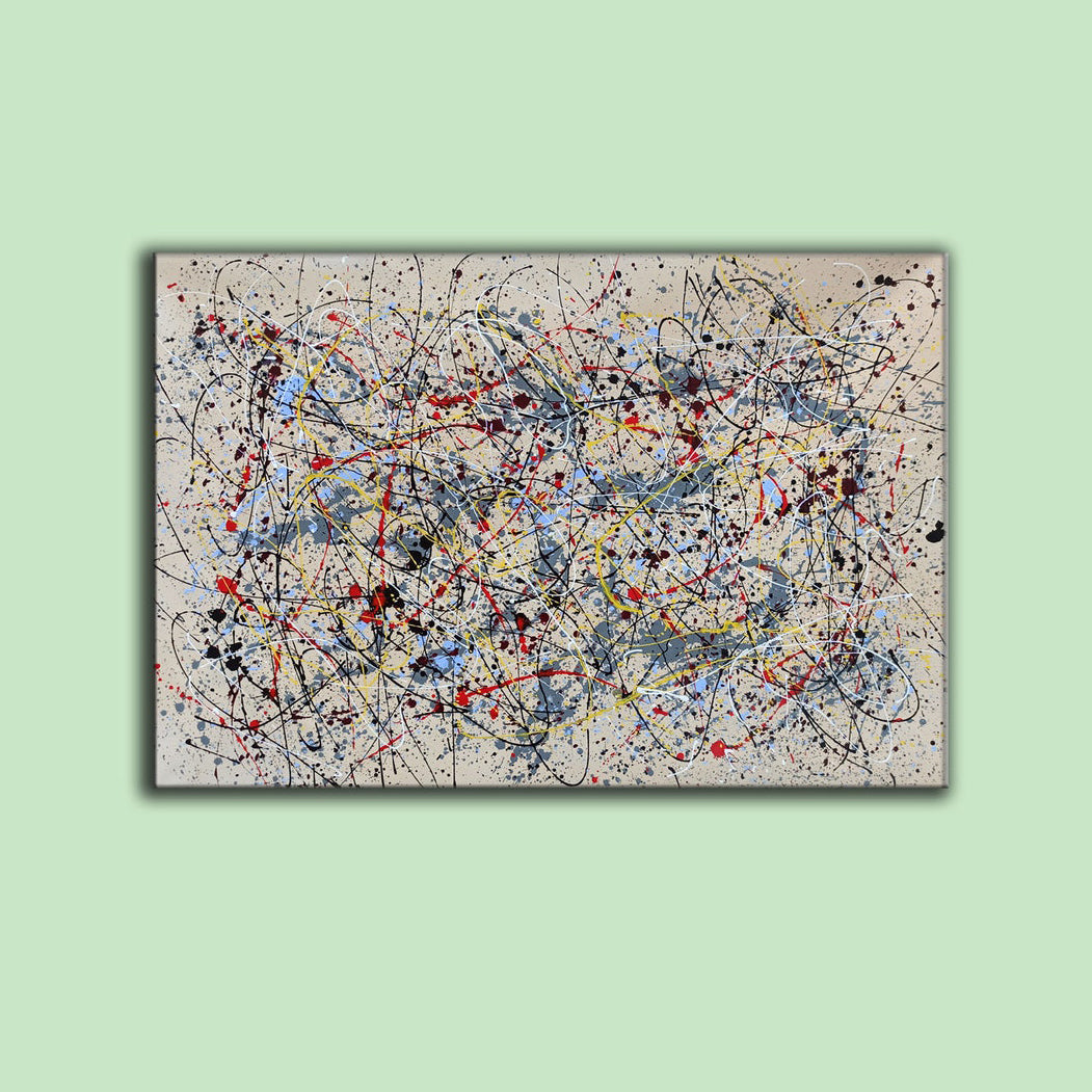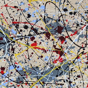 Complement is where chaos finds its rhythm. This abstract piece, inspired by the work of Jackson Pollock, layers splashes of color and intersecting lines into a beautifully balanced composition that will energize and complete any space.