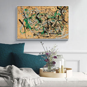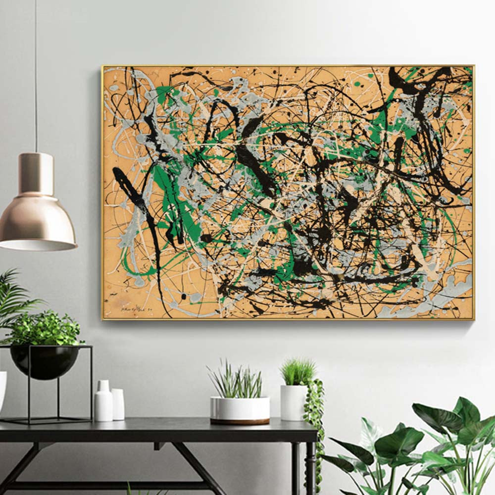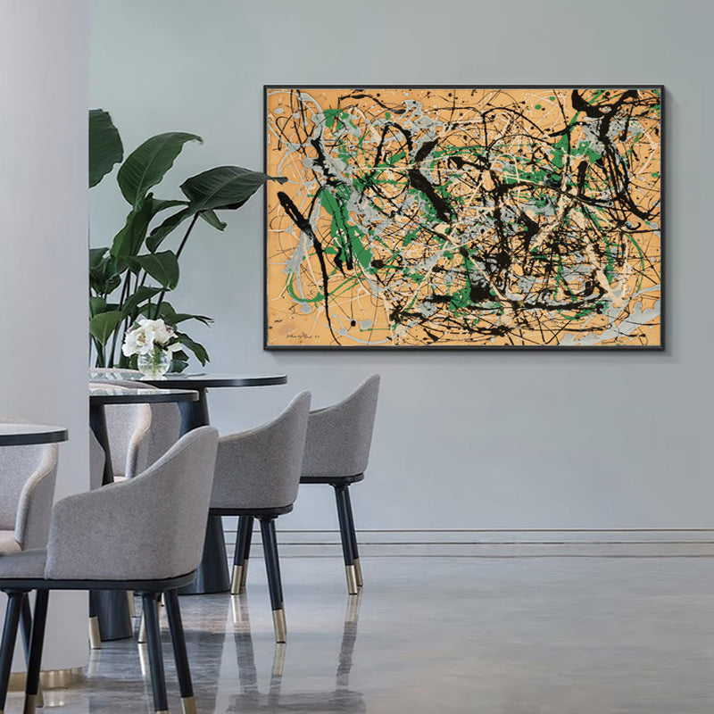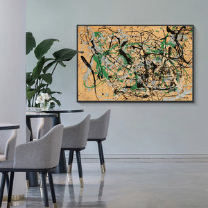 In this special artwork, a luminous yellow backdrop and fluid lines of white, green, and black intertwine, unveiling a beautiful display of color and motion. Embrace the radiance and captivating beauty of this piece, where pure splendor dances upon the canvas.