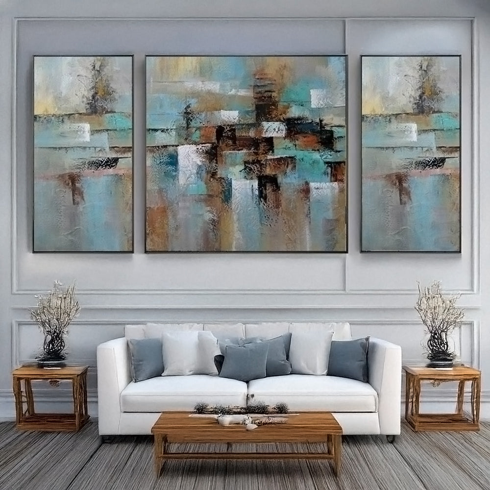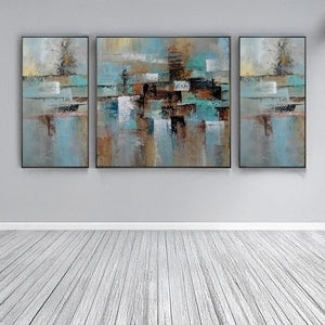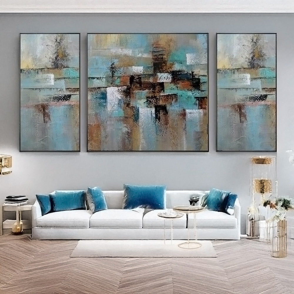 With the use of a special technique, this unique canvas set almost looks like it is covered in a beautiful layer of rust. Brown and blue colors dance along the canvas, giving this canvas set a dynamic and stunning atmosphere!