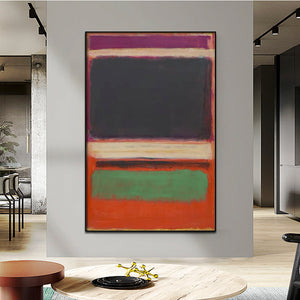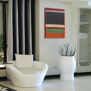 Seeing all the unusual colors blending together beautifully, it feels comforting and cozy. This modern art piece displays a minimal composition with a maximal result. The purple and green work stunningly with the orange background.