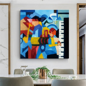 Step into a lively world where a pianist and saxophonist blend in a unique, colorful cubism-style. The canvas pulses with rhythmic abstraction, creating a visually harmonious symphony of colors and forms. The vivid colors make this painting suited for any type of home interior.