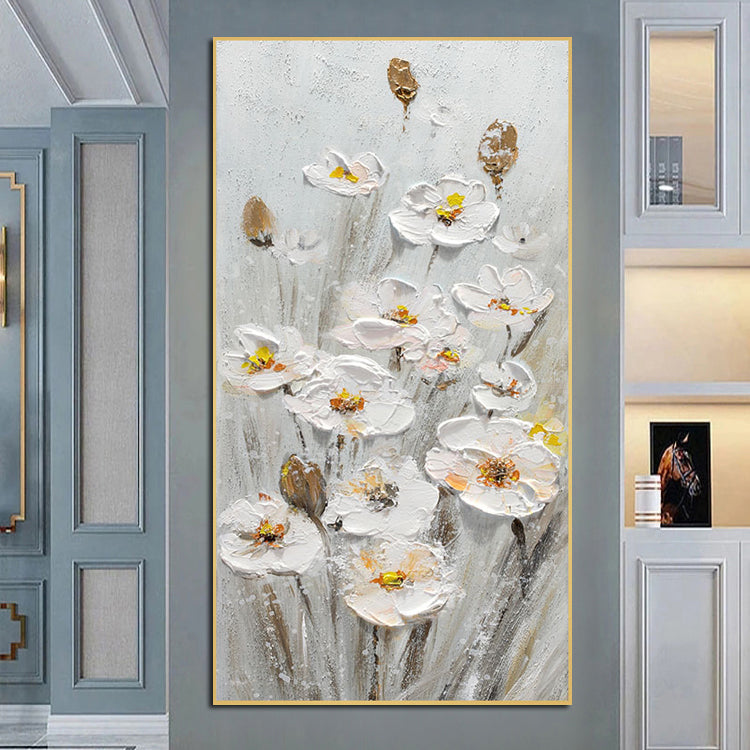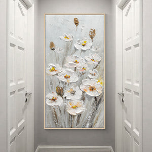 Lovely, white daffodils dangle beautifully on the gentle flow of the wind to create a merry sight. Through the use of various painting techniques, it almost seems as if the flowers dance right out of their canvas, creating a dynamic, floral atmosphere wherever it's portrayed!