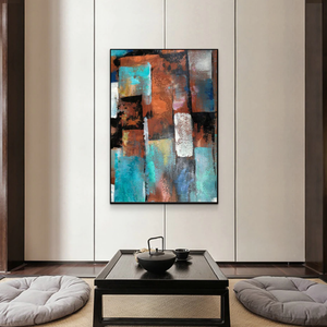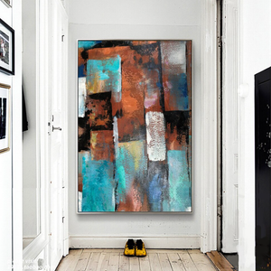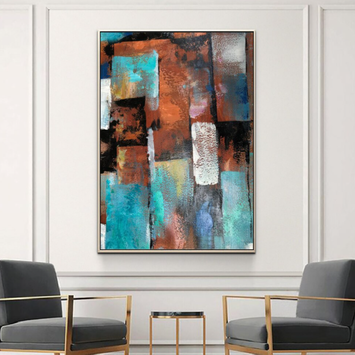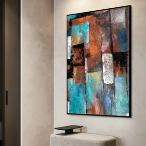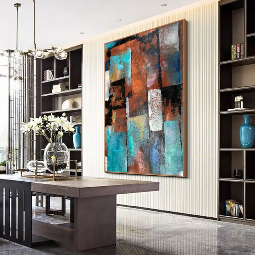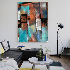 What makes this hand-made painting so unique is that each part is divided into unequal squares which all tell their own story. While simultaneously the bigger picture tries to tell another story... What story do you see?