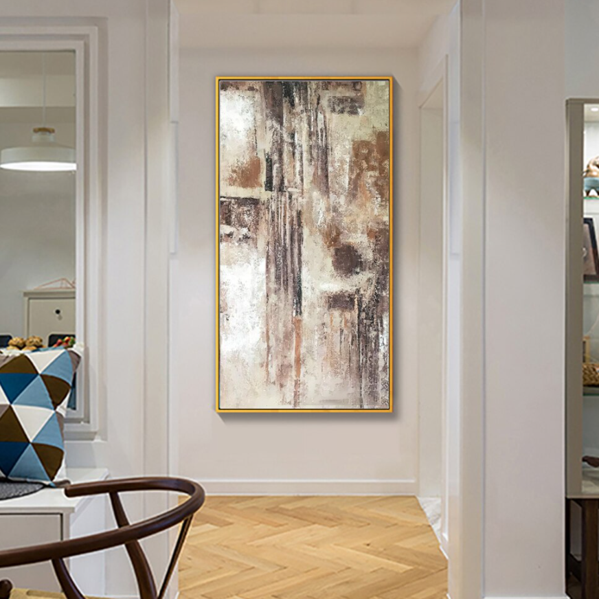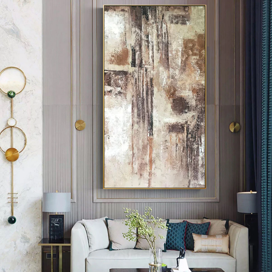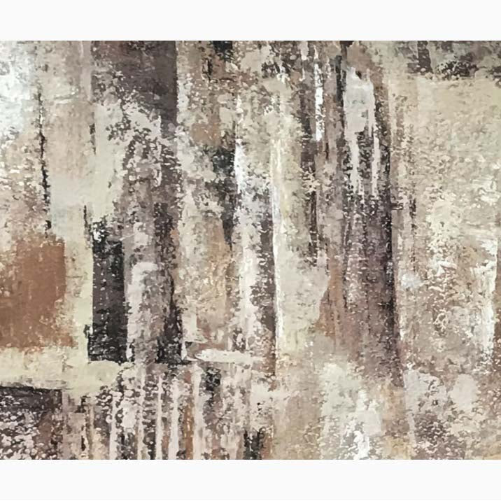 Many always wish to have the things most rare to them. Like the rain is to a desert. An extremely rare but blissful sight. Through the use of vertical brown strokes, the feeling of a downfall is created. These strokes contrast beautifully with the arid sand-coloured patches creating a sturdy yet captivating art piece.