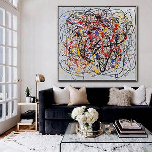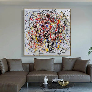 Discrepancy' is a modern artwork inspired by the contemporary art movement. Using a color scheme like Piet Mondriaan, this abstract painting has a unique composition! Loads of vibrant brushstrokes and splattered dots make this piece interesting, again and again!
