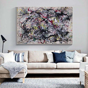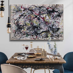 This modern art piece radiates lively energy. Twisting brushstrokes and vibrant bursts of color form a captivating display of abstract expression. The chaotic composition, where colors and shapes mix harmoniously in a rhythmic dance, keeps you interested, time after time!