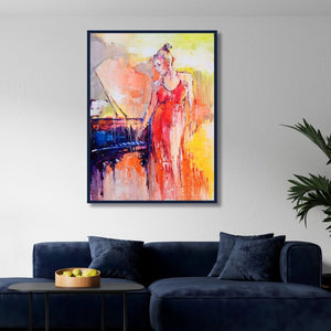 What happens when the curtain closes and the music fades? The show is over but life continues... This great impressionistic artwork displays a beautiful lady in red finishing a wondrous concert. But what would she do now the music has faded?