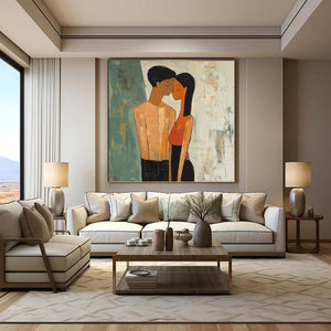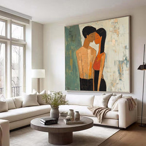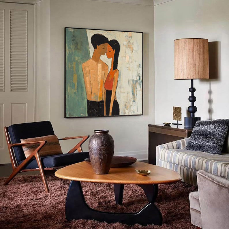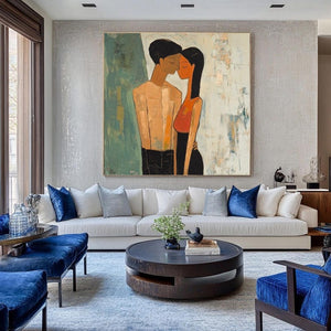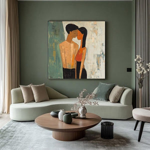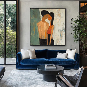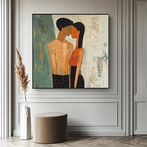 Love is in the air with Fiancée's. This artwork beautifully shows the quiet intimacy of a couple lost in their own world. The soft textures and warm tones make it a perfect statement piece, celebrating love in its purest form. Perfect for those who believe that true love speaks without words!