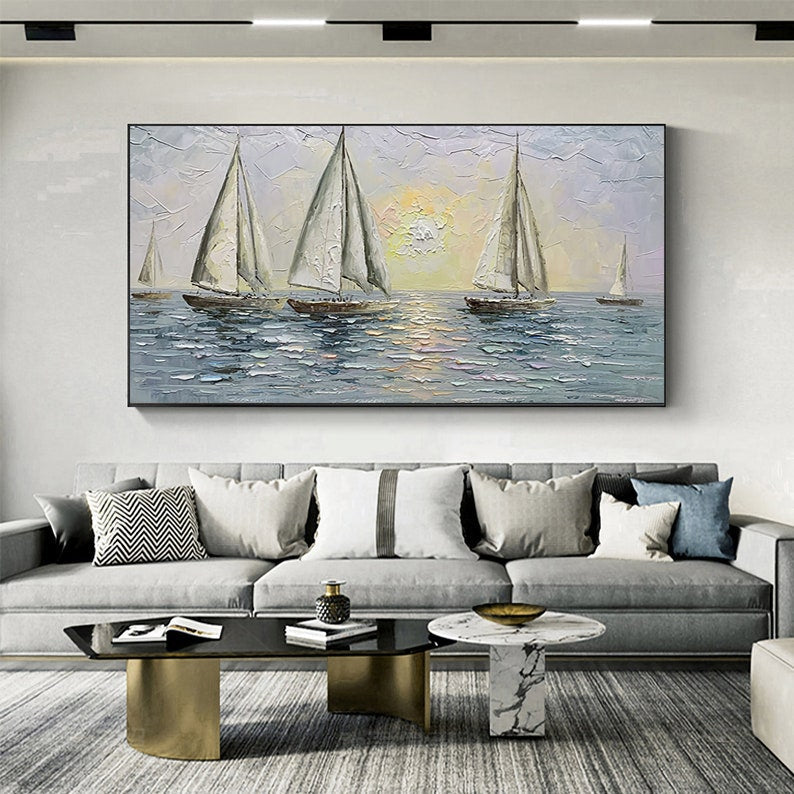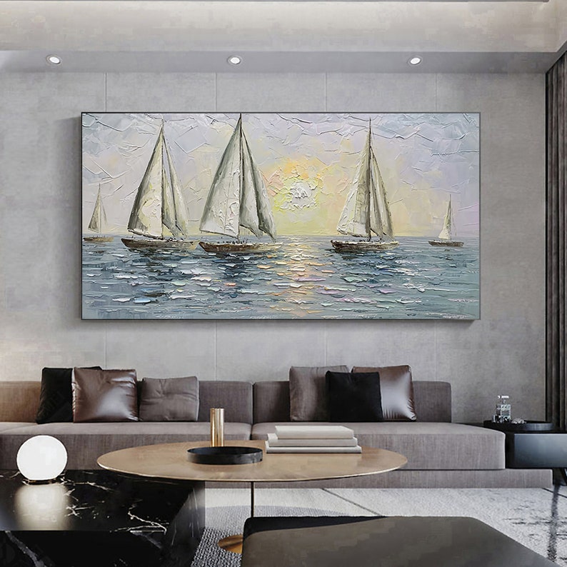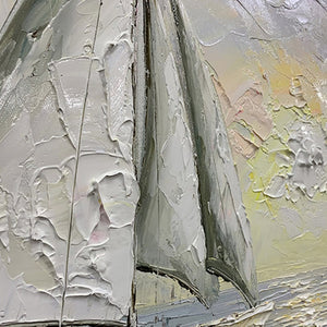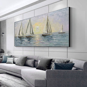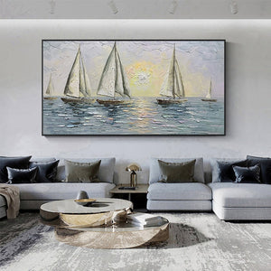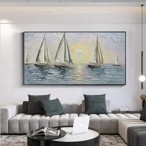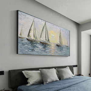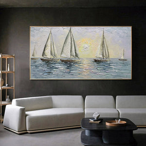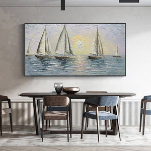 Carried by the wind, these sailors try their luck navigating the endless ocean. With a unique texture and a soothing composition, this fantastic piece will create a beautiful maritime atmosphere wherever portrayed!