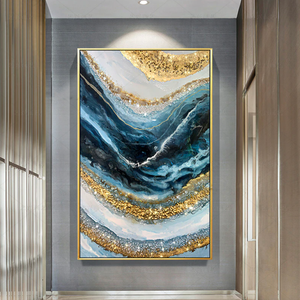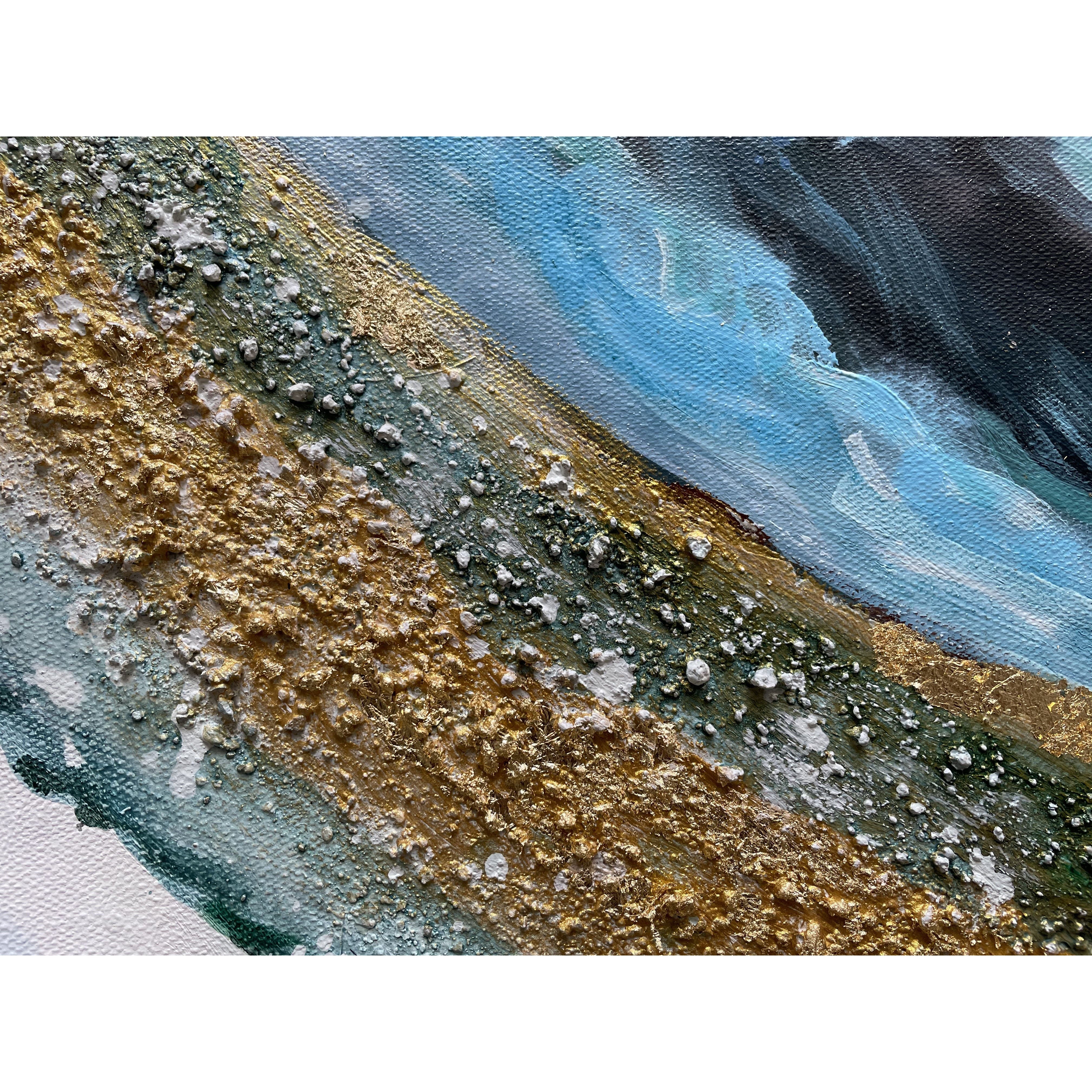 What a magnificent piece it is! The astonishingly realistic wave crashes majestically on the sparkling golden coast. Through the use of multiple horizontal layers and different convincing shades of blue, this painting also has a lot of depth.
