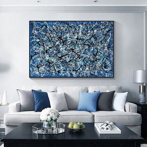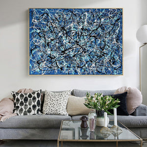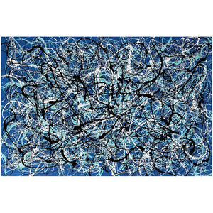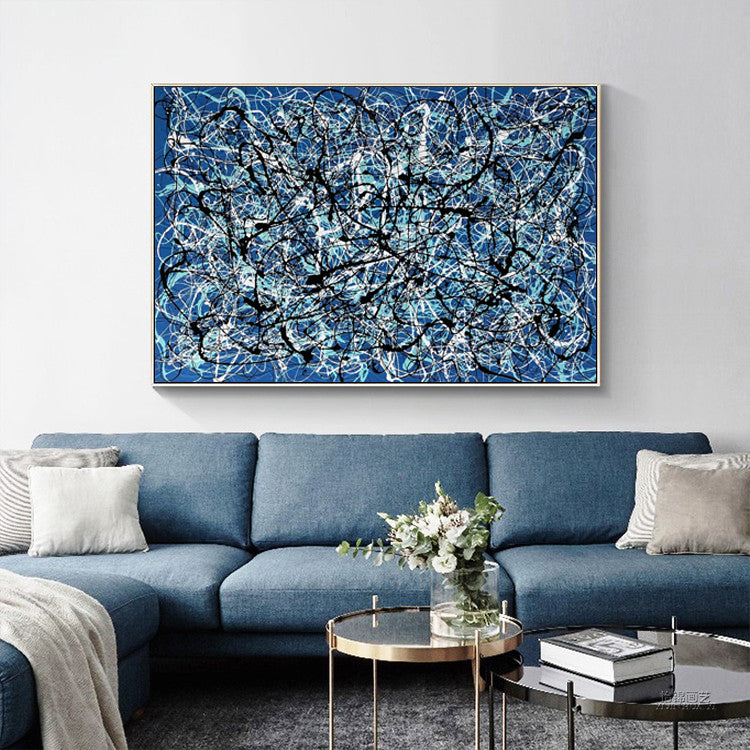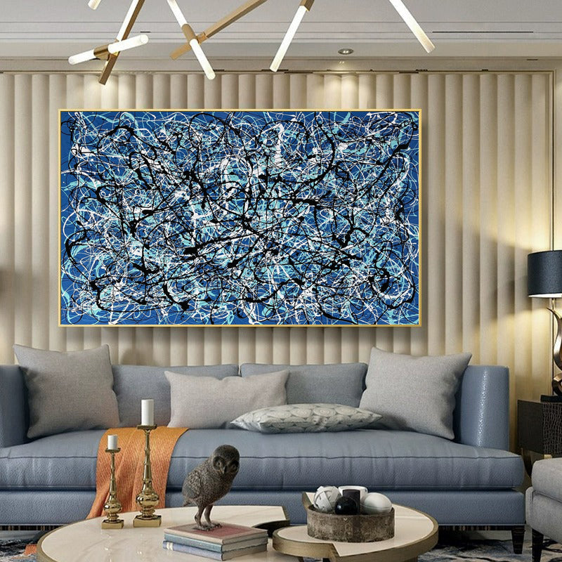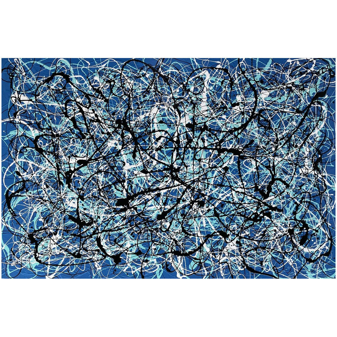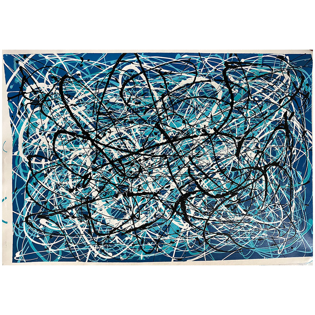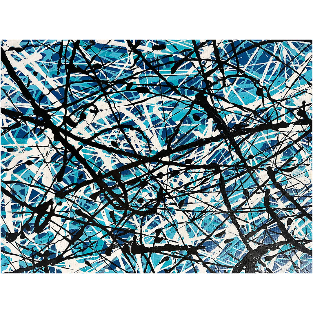 Within the captivating canvas of 'Lost', a beautiful blue background embraces a unique choreography. Vivid white and black lines dance along the dynamic composition, evoking a sense of wonder, as if walking through the labyrinth of the unknown.
