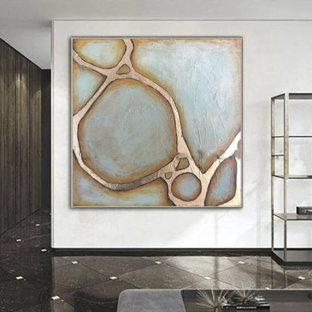 Who would have known a destructive, powerful substance like magma could be portrayed so majestic and stylish? This stunning, abstract art piece, due to its calming colours, is an addition to any space or room. Create a feeling of warmth and toughness with this grey-gold composition!