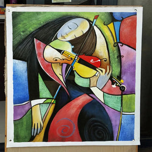 Melancholic Harmony' is a painting with a cubist style, inspired by Pablo Picasso. The main characteristic of this work is the use of many different colors arranged in an ordered and beautifully balanced composition.
