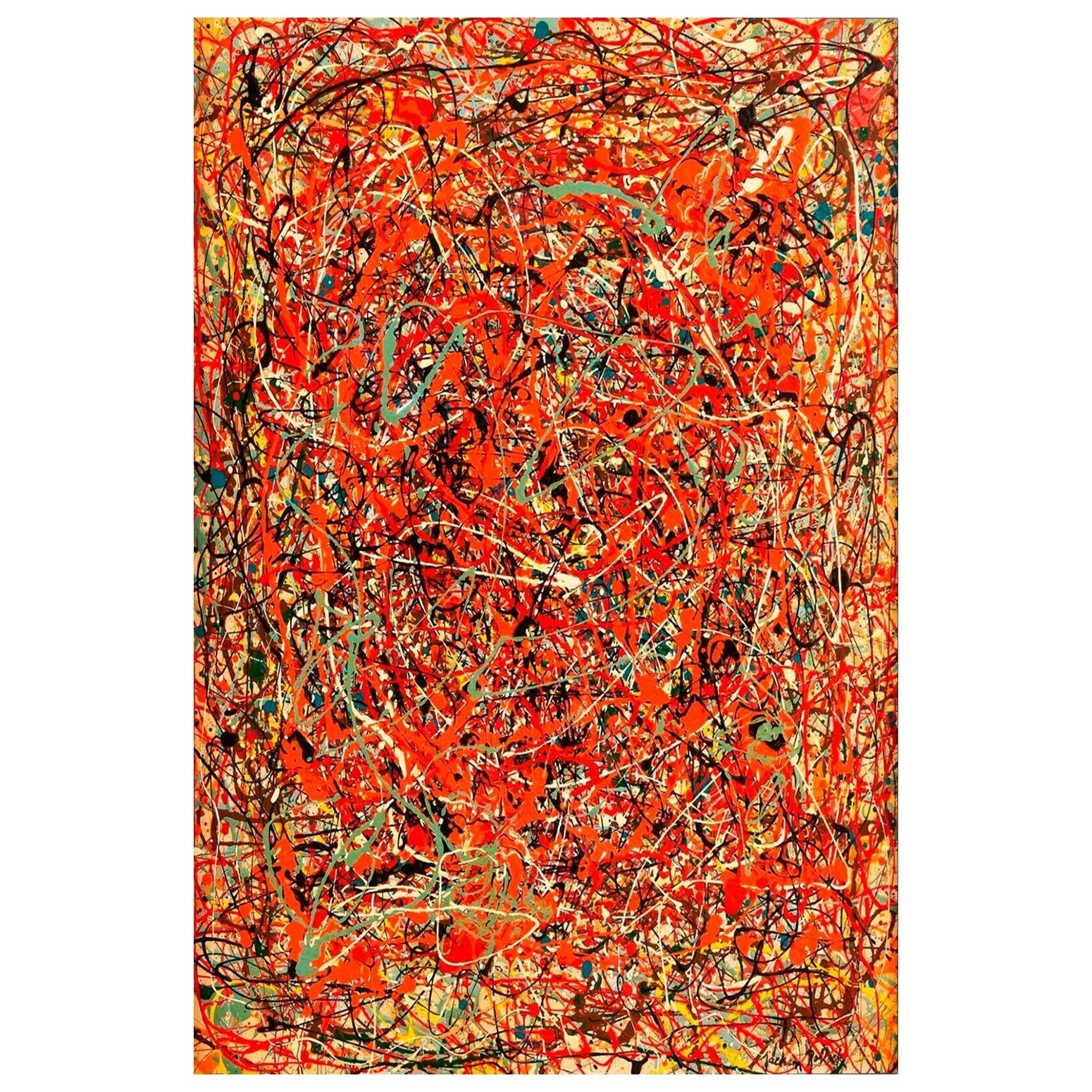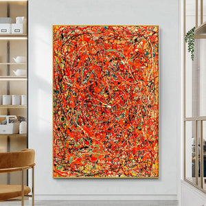 In this dynamic artwork, a blazing red background ignites a whirlwind of chaos.. Experience the raw energy and intensity captured in this painting, where passion and colorful mayhem merge into a mesmerizing meltdown of artistic expression.
