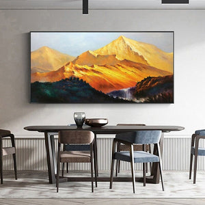Translated from French, this amazing art piece is titled: 'The Golden Mountains'. And beautiful gold they are! With outstanding details and a stunning, golden glow, this fine piece really catches the eye and improves any home interior!