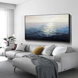 Glittering sunlight reflecting beautifully on the dark, blue sea... What a sight to behold! This fantastic realism artwork portrays the astonishing beauty of an idyllic ocean sunrise! Its realistic color scheme makes this piece suited for many types of home interiors!