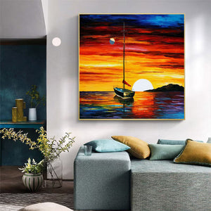 Ocean Sunset brings the glow of the horizon into your home. The fiery colors of the setting sun, mirrored by gentle waters, create a great sense of calm and beauty. Let this painting transform your space into a serene escape, where every day feels like a vacation.