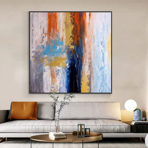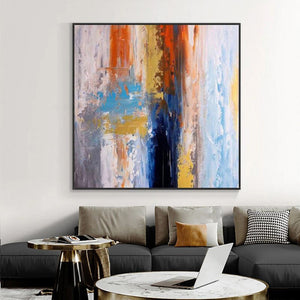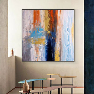 This painting flows like a dream, with bold colors cascading into layers of texture and harmony. The bold palette of blues, oranges, and yellows creates a lively energy that’s perfect for sparking inspiration in any room.