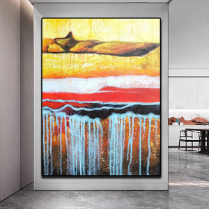 With a dynamic composition and a unique color palette, this is a special piece! This abstract painting displays the different layers of the earth beautifully. And thanks to a special technique, the paint feels as if it is dripping from the canvas!