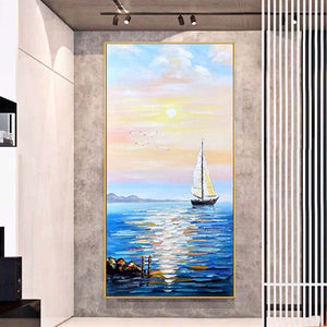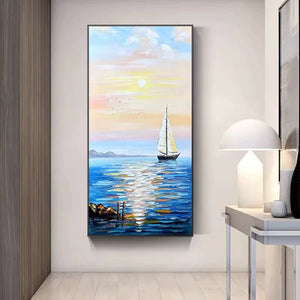 This impressionistic artwork displays three vivid sailing ships sailing the wild waters of the open ocean. The unique painting style and many surprising colors make this artwork a beautiful addition to any space.