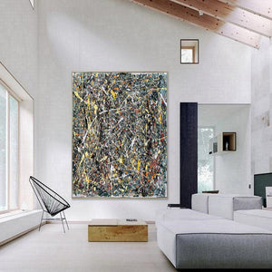 Pollock's inspired 'Solemn' captures the quiet energy of reflection through its intricate web of colors and movement. This painting balances bold strokes with deep thought, making it a striking yet meditative addition to your space.