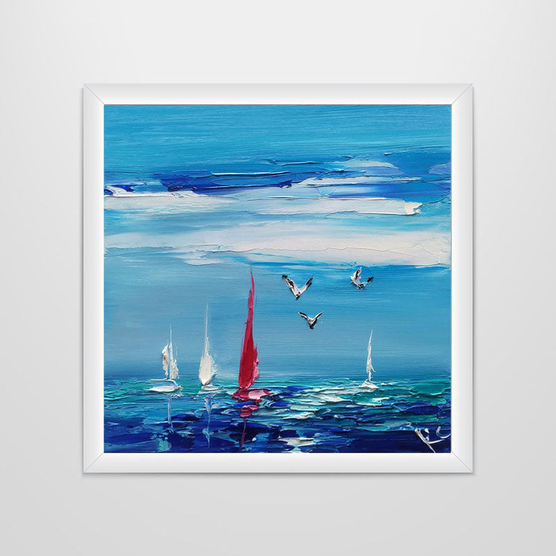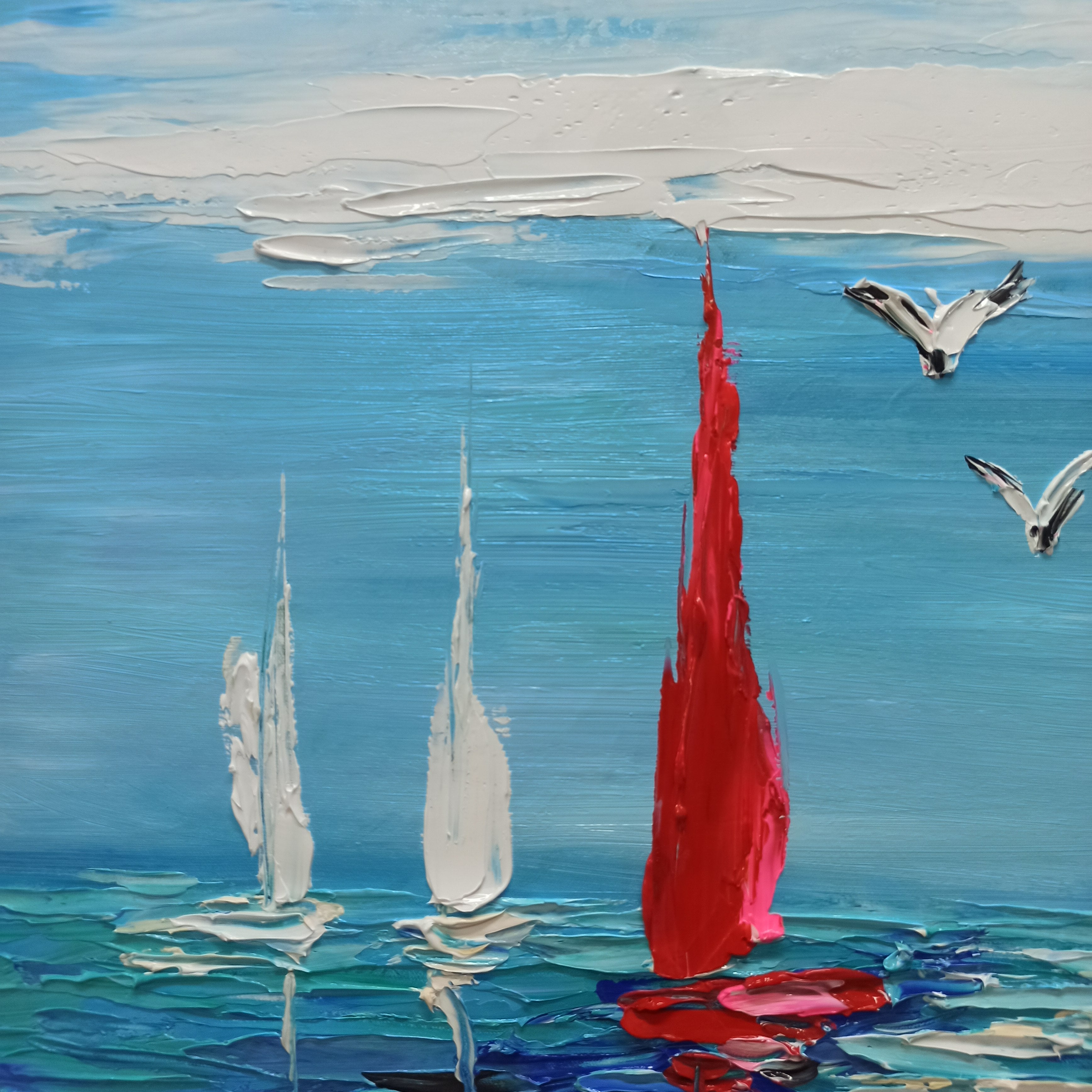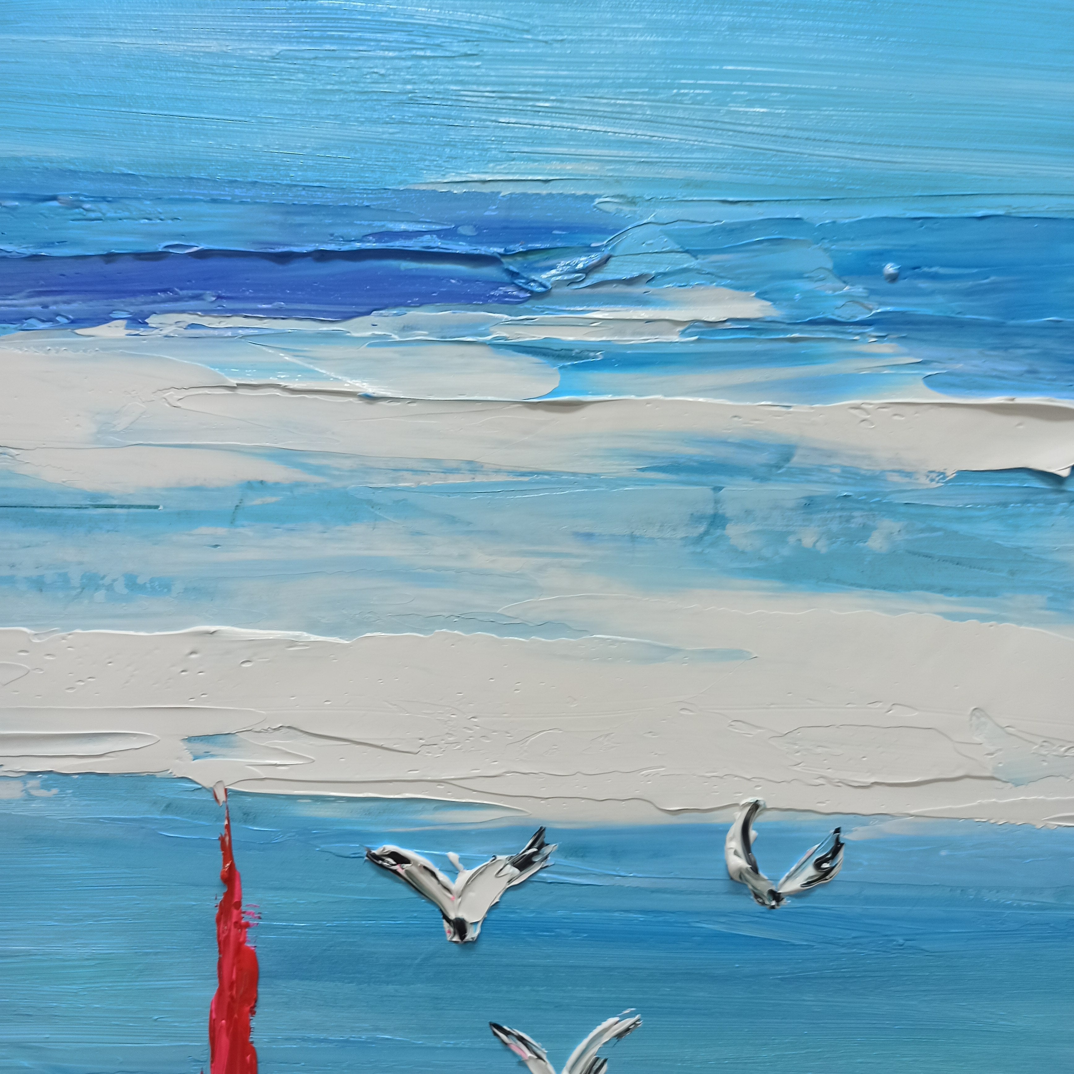 Bring the lively spirit of the ocean into your home with this stunning painting. The vivid blues, dynamic brushstrokes, and contrasting red sailboat create a captivating scene that will delight you, time after time!