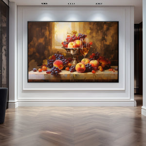 Experience elegance through this exquisite still life. The fruits seem almost edible in their lifelike presentation, making it a feast for the eyes. The stunning realism-style makes this painting a rich and sophisticated addition to any space or room.