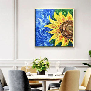 "Sunflower Days" is a burst of sunshine! The golden sunflower comes alive with bold strokes, surrounded by a swirling blue sky. It’s the perfect way to bring nature’s brightness into your home, no matter the season.