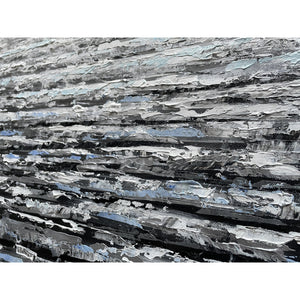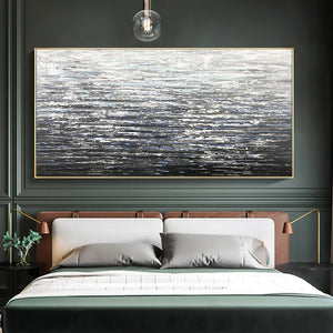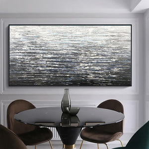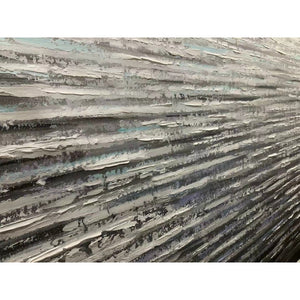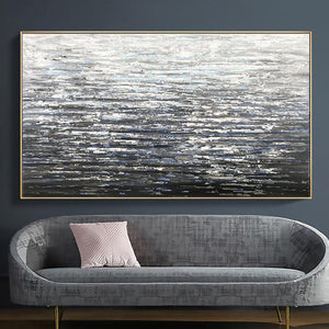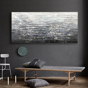 This beautiful large artwork portrays stunning grey horizontal lines. Together, they create a glowing wave of contrast, like a shining surface. With the use of primarily subtle colors, this unique art piece will suit any type of home interior!