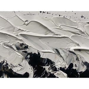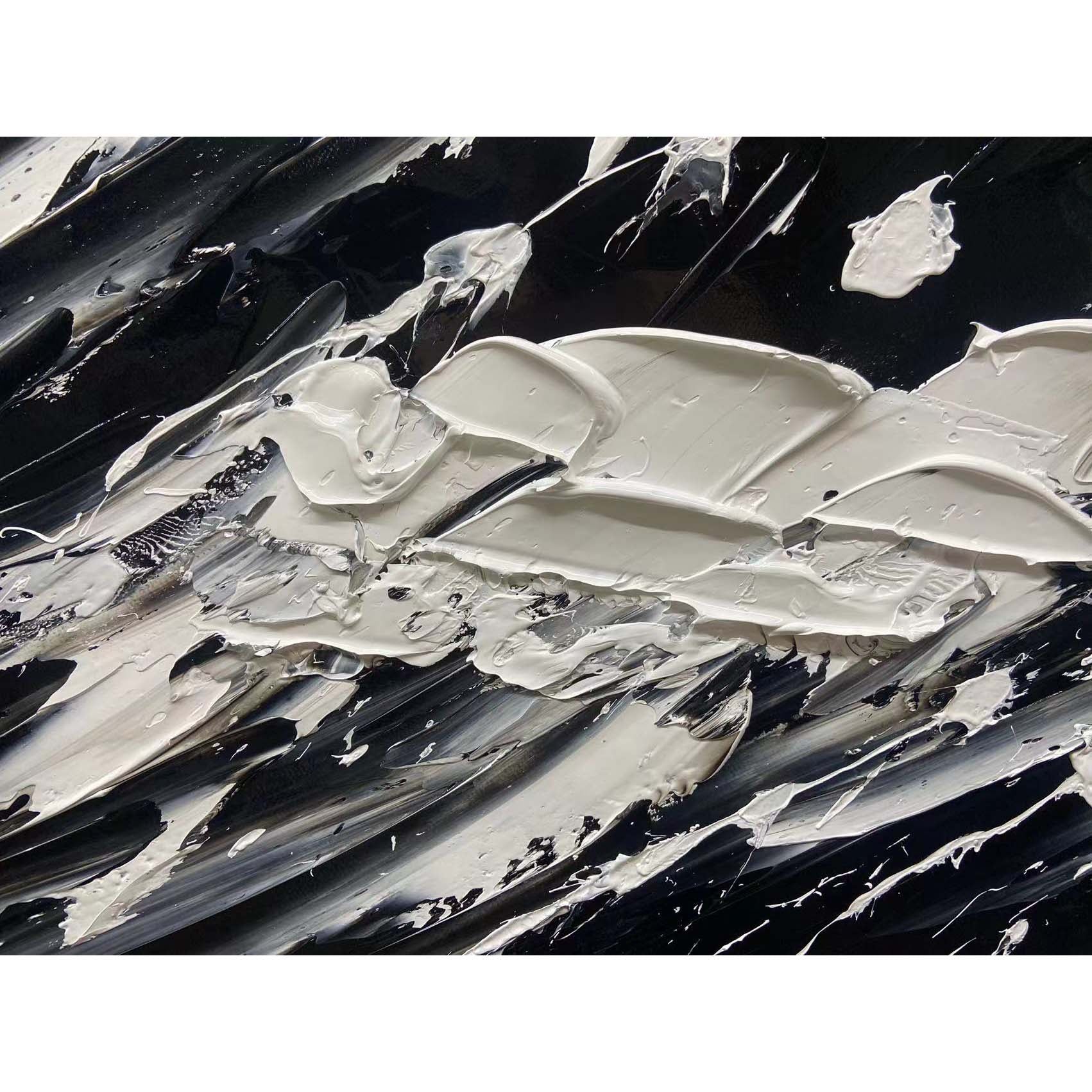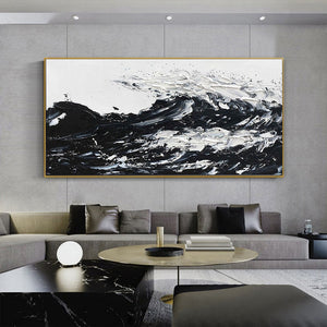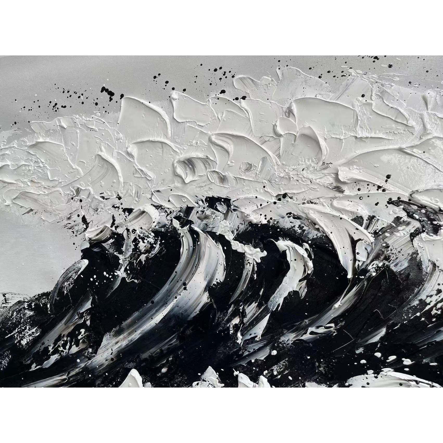 Fierce, powerful, and glorious, this is 'The Black Wave'. This stunning composition shows us the power of nature in beautiful black-and-white colors. The dynamic brushstrokes give a sense of movement, making you almost hear the waves crash!