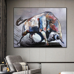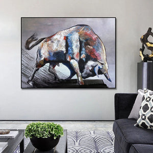 Unleash power with The Charging Bull. This powerful painting combines strength and artistry, showcasing a bold bull in vivid motion. The mix of colors and dynamic brushstrokes brings the piece alive, perfect for adding inspiration and energy to any room.
