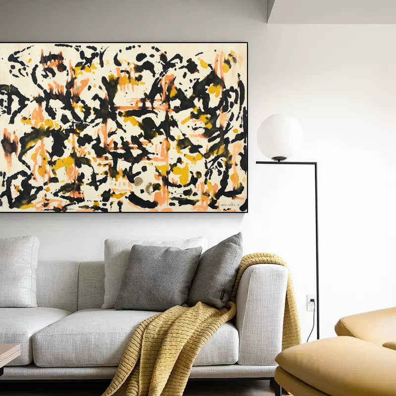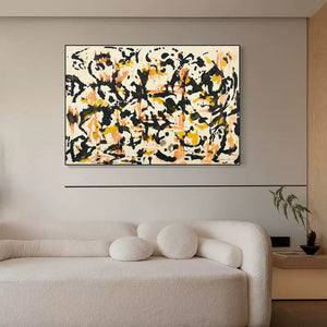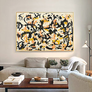 In the captivating artwork, a clean white canvas becomes a lively stage. Playful dots of black, yellow, and pink engage in a vibrant dance, drawing you for attention. Experience the joyful competition of colors, as they join in a lively contest of brightness and creativity.