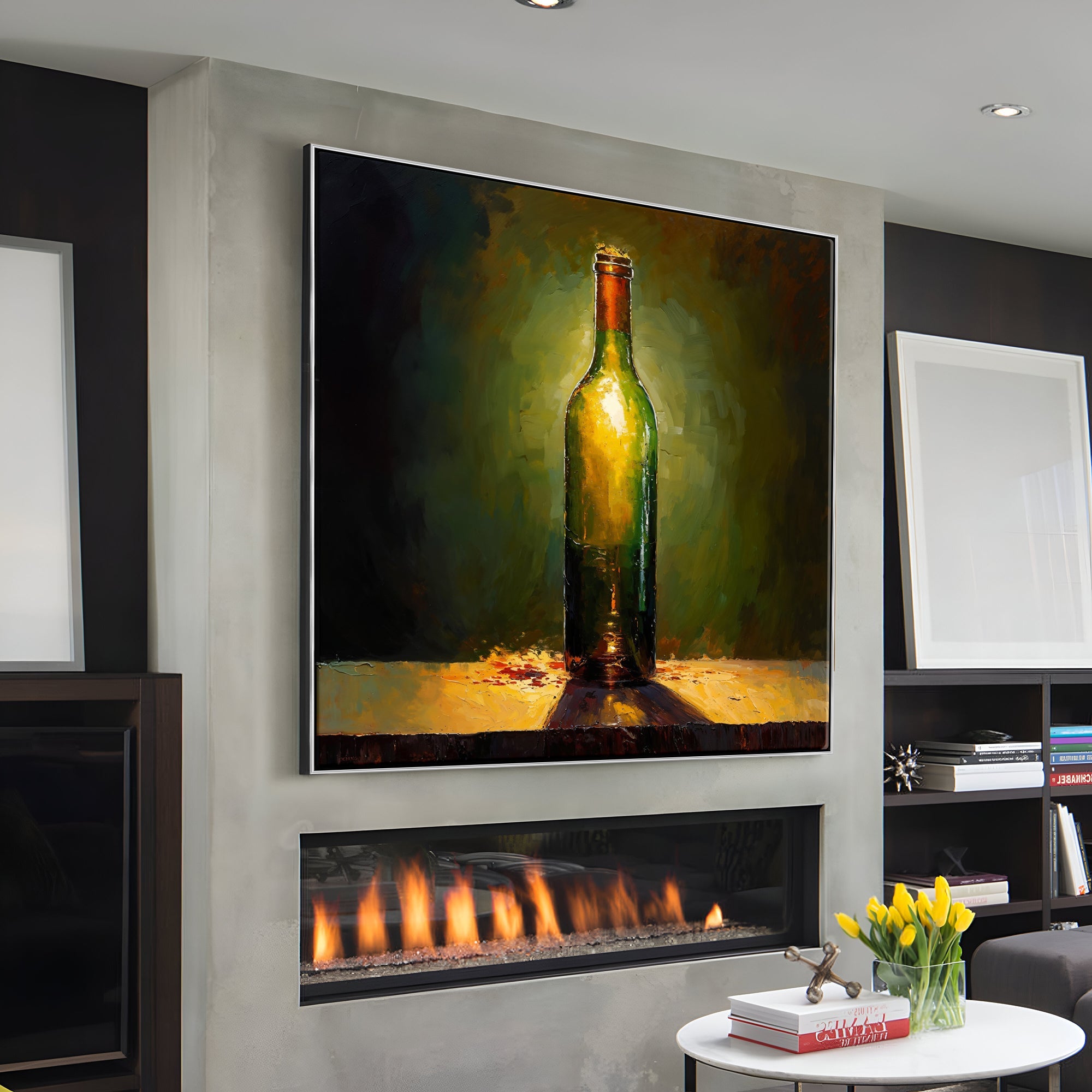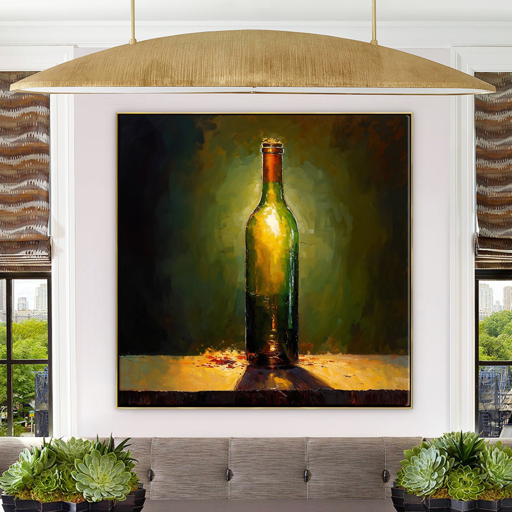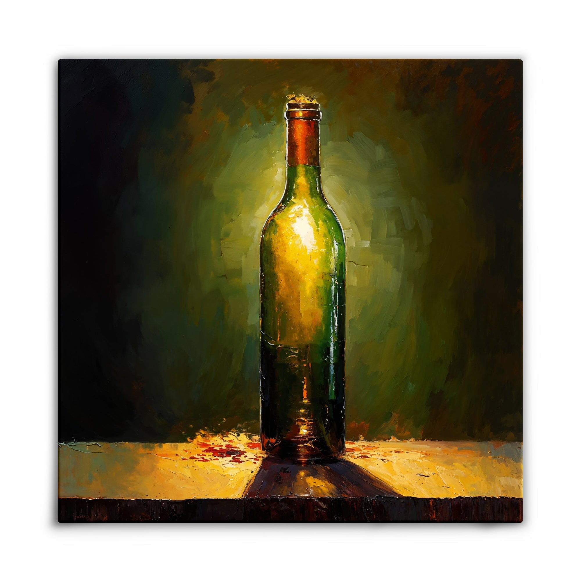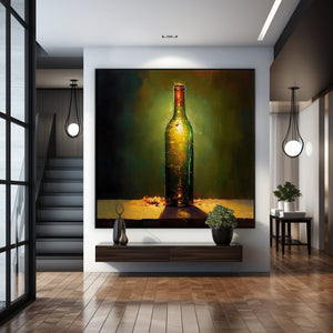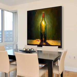 With amazinguse of lighting and a stunning realism-style of painting, this piece really comes alive! Showcasing the beauty of wine through an almost angelic light, this piece adds something special to any space.