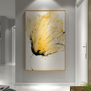 This modern artwork beautifully portrays a golden lily opening up! With the subtle and contrasting colors yellow and black, this painting will look stunning alongside any home interior.