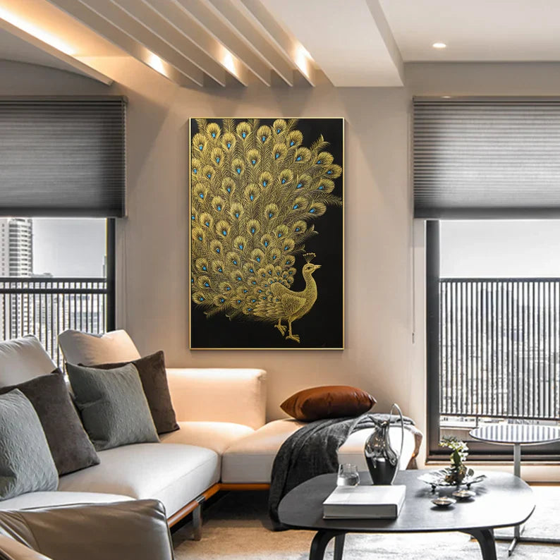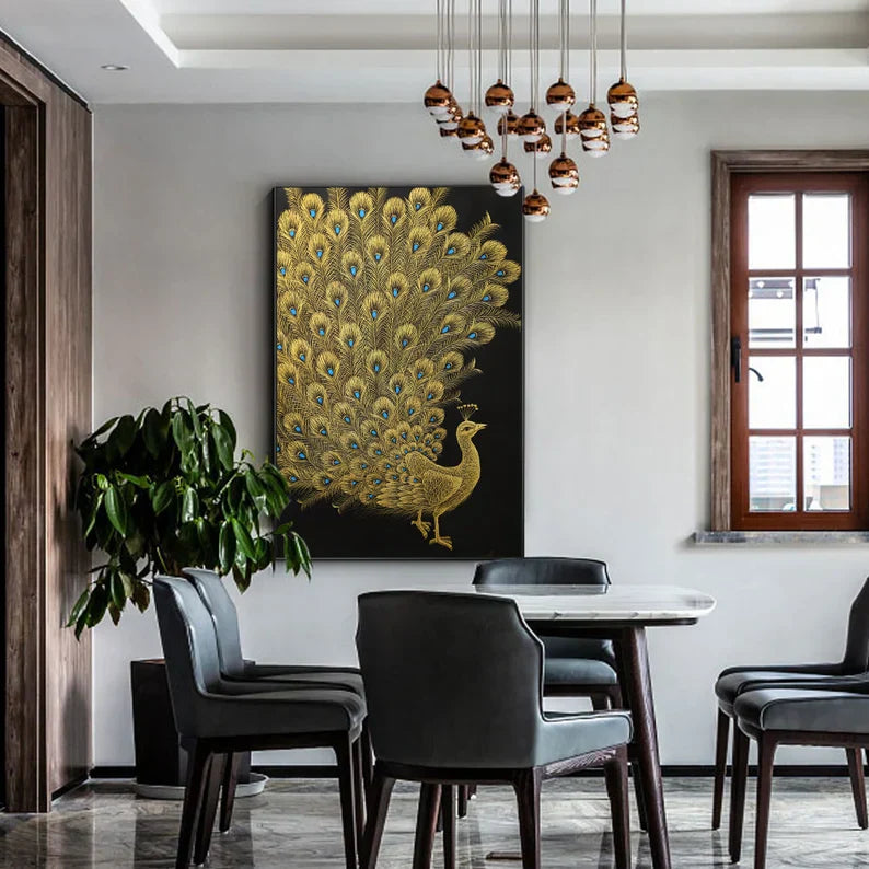 Add a touch of royalty to your walls with this stunning artwork. The peacocks intricate golden feathers and bold design make this piece an instant centerpiece for any space seeking timeless elegance.