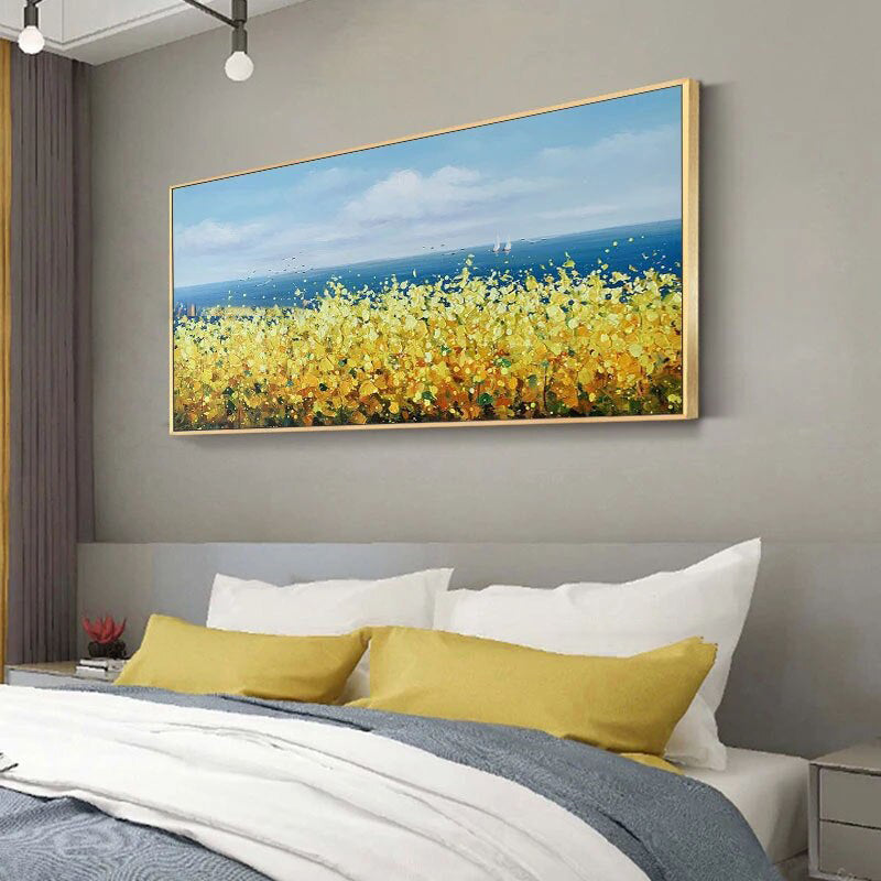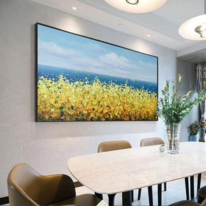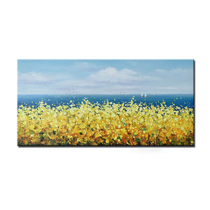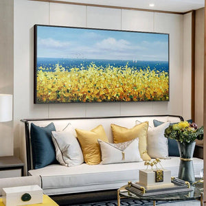 Bask in the beauty of "The Golden Shore." This beautiful art piece brings the radiance of a golden field meeting a serene blue sea into your space. With vibrant yellow blossoms and soft horizon hues, it’s an escape to tranquility.