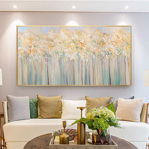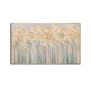 Sparkling in the reflection of the sun stands the beautiful Golden Woods. The lush, gold strokes of paint and the jolly composition will always put a smile on your face if you look at it! A touch of elegance for any home interior!