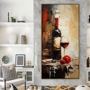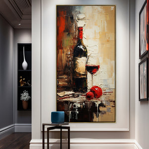 This art piece portrays a wine bottle and glass with a touch of impressionism. Each brushstroke captures the essence of a wine's journey from vineyard to glass in a burst of color.