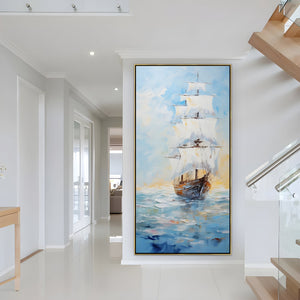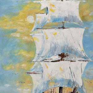Did you know that Christopher Colombus discovered North America with the Santa Maria? This impressionistic art piece is inspired by the white sails of the ship, captured gracefully in this subtle composition.