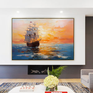 As the sun dips below the horizon in 'The Wayfarer,' the ship sails on in an impressionistic landscape. This piece captures the essence of dreams, adventures, and the allure of the open sea.