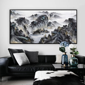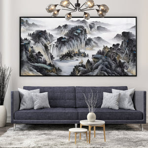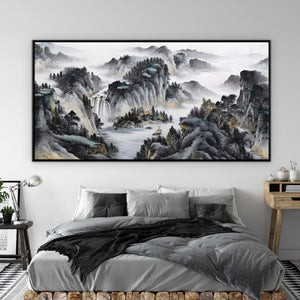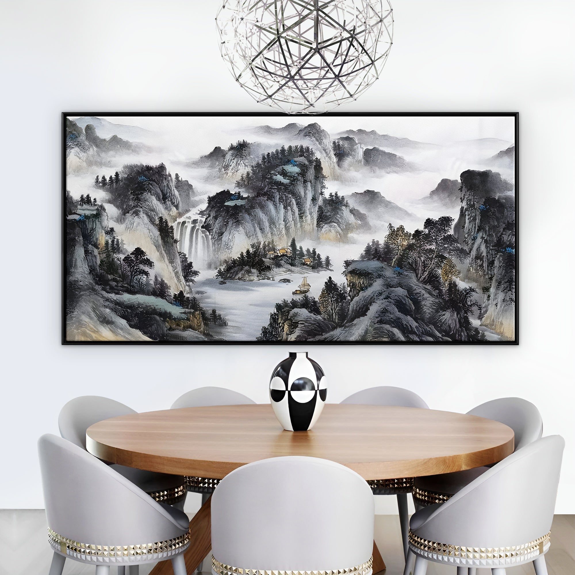 Step into the world of 'Valle Nera,' where monochrome colors paint a majestic landscape. This painting captures the stark beauty of valleys and mountains in a unique black and white style.