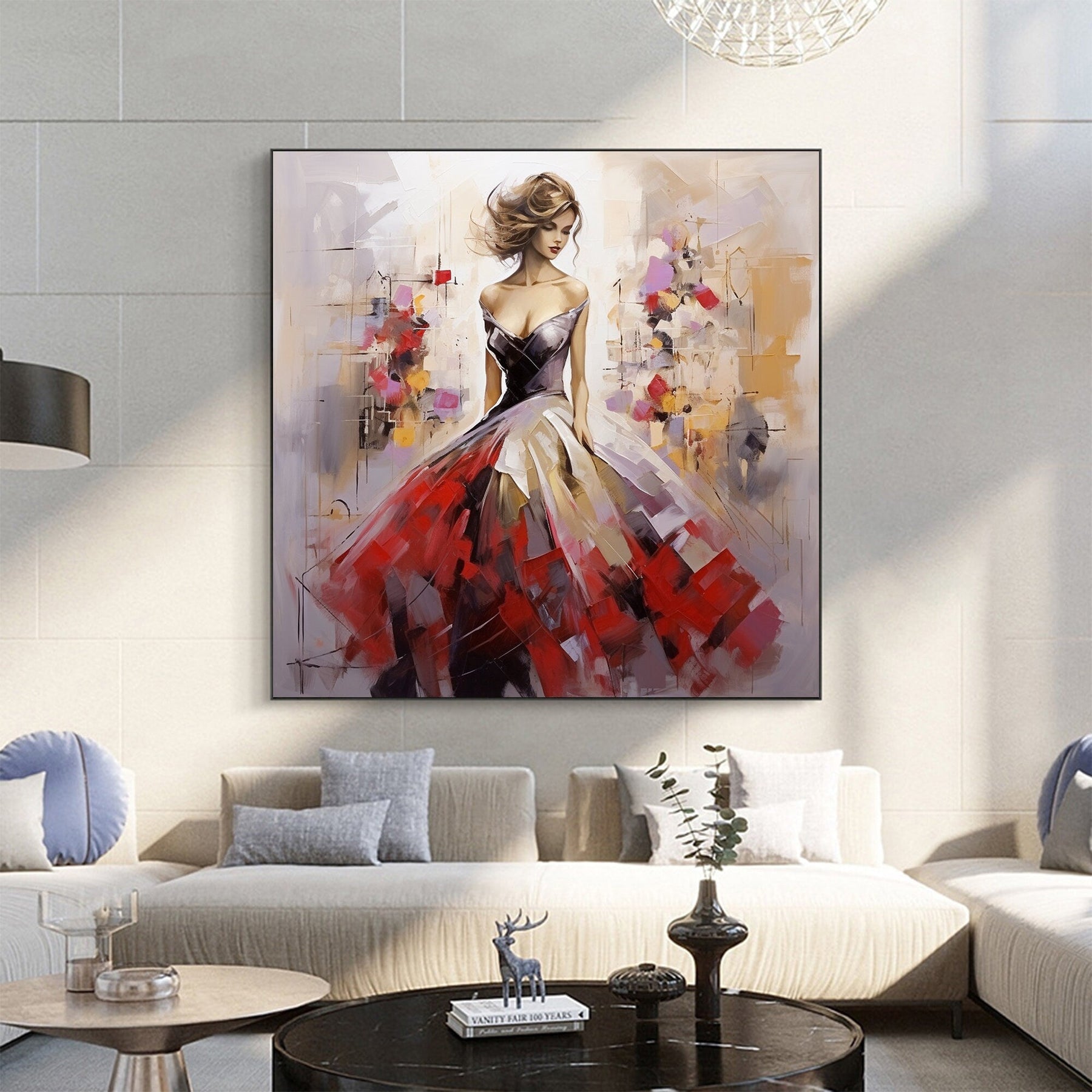 Transform your dining room with this striking Hand-Painted Oil Painting of Abstract Elegance. The dynamic scarlet and grey tones make it a stunning, glamorous centerpiece. Shop original hand-painted art!