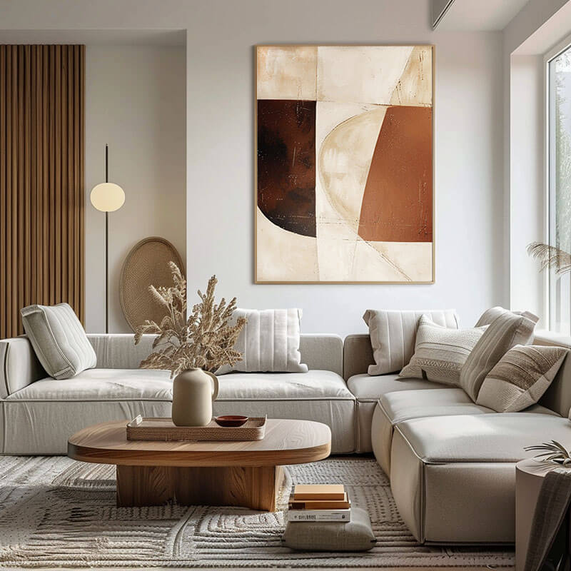 This sophisticated 100% Pure Hand-Painted Original Oil Painting features a dynamic composition of deep browns, terracotta, and soft beige. Bold geometric shapes demonstrate Terra Cotta Geometry and an intriguing Circular Interplay of forms. This guaranteed Hand-Painted Oil Painting is a minimalist statement piece, adding earthy elegance and visual balance to any space.